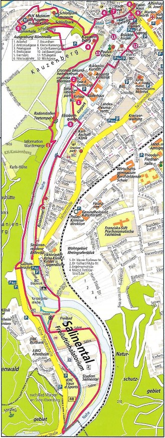 laufen am Schwimmbad vorbei auf ein weiteres Gradierwerk zu. Hier folgen wir der Markierung nach links, bis wir wieder auf die Nahe treffen. Nun führt uns unser Weg immer geradeaus die Nahe stromaufwärts an dem Sportgelände Salinental vorbei bis zur Stadtgrenze. Hier, an der Spitzkehre, geht es nun scharf rechts zurück in die Stadt. Zunächst an vielen Kleingärten vorbei, dem Wasser- graben auf der linken Seite folgend. Auch auf diesem Weg durchschreiten wir nach einiger Zeit einen Gradierwerkdurchlass, bleiben auf unserem Weg und erreichen so die Salinenstraße. Dieser folgen wir bis zum Zebrastreifen und überqueren hier die Straße. Unser Weg führt uns nun nach rechts und schon nach ca. 100 m haben wir den Nachtigallenweg erreicht. In diesen biegen wir ein und laufen nun bis fast ans Ende des Weges. Ca. 10 m vor dem Hotel Quellenhof (auf der rechten Seite geht die Hängebrücke über die Nahe) biegen wir dann links in den Wald und gehen den zum Teil mit Treppen versehenen Weg bergauf, bis wir rechts auf einen breiten Weg treffen. Diesem Panoramaweg folgen wir nach rechts, leicht bergab und genießen dabei den wunderschönen Blick über das Kurgebiet und einen Teil der Stadt Bad Kreuznach. Bald kommt links eine ca. 58m lange Steigung, die wir überwinden müssen. Oben angekommen geht es nun ein kurzes Stück ebenerdig um dann nochmals für 39m anzusteigen. Nun sind wir auf dem höchsten Punkt unserer Wanderung angelangt, der Kauzenburg. 4 . (Einziger nennenswerter Anstieg auf der gesamten Strecke). Von der Höhe aus geht es nun links weiter, bis wir zu einer Abzweigung auf der rechten Seite kommen. Dem schmalen Weg folgen wir ein kurzes Stück bis zum Eingangstor zum Schlosspark, welches wir passieren. Den breiten Waldweg, wandern. wir bergab. Unten angekommen folgen wir links der Beschilderung zum Rittergut Bangert. Von dort sind es nur ein paar Schritte zum neuen Puppenmuseum und zur Römerhalle. 5 . Von der Römerhalle geht es dann die Hüffelsheimer Straße rechts leicht abwärts am Restaurant „Im Gütchen“ vorbei der Mauer des Schlossparks folgend bis zum Türdurchgang in der Mauer. Diesen durchschreiten wir nun und befinden uns erneut im Schlosspark. Wir folgen dem ausgeschilderten Weg am Schloss vorbei (in den Räumen des Schlosses ist das Bad Kreuznacher Museum untergebracht) bis zum Ausgang des Parks. Nun halten wir uns links, überqueren die Ellerbachbrücke und biegen nach dem Verlassen der Treppe gleich nach rechts ab. Wir folgen der Markierung durch die engen Gassen des Gerberviertels und nach kurzer Zeit erreichen wir den Salzmarkt, in der Fußgängerzone 6 . Wir halten uns nun etwas rechts, überqueren den kleinen Salzmarkt und biegen dann in eine sehr schmale Gasse ein, die von den Einheimischen als „die vier Arschbacken“ bezeichnet wird. (links von dem Gässchen befindet sich eine Pizzeria). Die Gasse mündet in den Eiermarkt 7. Wir überqueren nun den Eiermarkt lassen dabei die Nikolauskirche 8 rechts und das Michel Mort Denkmal links liegen, gehen am alten Rathaus (links am Ausgang des Marktes) vorbei und gelangen so in die Poststraße. Hier folgen wir der Auszeichnung, überqueren die Poststraße und biegen rechts in eine weitere kleine Gasse (das Reilchen) ein. Das Reilchen mündet dann in die Magister-Faustgasse. Nun halten wir uns links und schon nach wenigen Metern (unter der Wilhelmsbrücke hindurch) steht man vorm historischen Faust Haus 9 . Unser weiterer Weg führt uns ein kurzes Stück zurück wieder unter der Brücke hindurch um danach direkt links die Treppe auf die Brücke hochzugehen. Wir befinden uns nun auf der Wilhelmsbrücke 10. Wir überqueren auf dieser Brücke die Nahe und haben dabei einen herrlichen Blick rechter Hand auf die Pfeffermühle, 11 und „Klein Venedig“. Am Ende der Brücke biegen wir rechts in die Kirschsteinanlage, die wir durchschreiten. Wir laufen über das Mühlenwehr. Auf der rechten Seite über dem Mühlenteich sehen wir nun die Brückenhäuser, 12 das berühmte Wahrzeichen der Stadt. Ein paar Schritte weiter biegen wir dann rechts in die Mühlenstraße ein. Noch ein paar Schritte und wir befinden uns auf dem größten Marktplatz unserer Stadt, dem Kornmarkt. 13 . Vom Kornmarktbrunnen mit seinen Kreuznacher Originalen biegen wir rechts in die Rossstrasse und wandern am Mühlenteich und der auf der rechten Teichseite gelegenen Pauluskirche 14 vorbei. Schon nach wenigen Metern kommt die „Geesebrick“ für Nichtkreuznacher „Geißenbrücke“ die wir überqueren. Auf der anderen Teichseite angekommen gehen wir links in die Kurhausstraße und folgen dieser Straße bis zu dem großen Parkplatz vor dem Bäderhaus. Von diesem vielleicht schönsten Wellness-Bad Deutschlands gelangen wir dann wieder am Kurhaus vorbei zu unserem Ausgangspunkt dem Haus des Gastes.