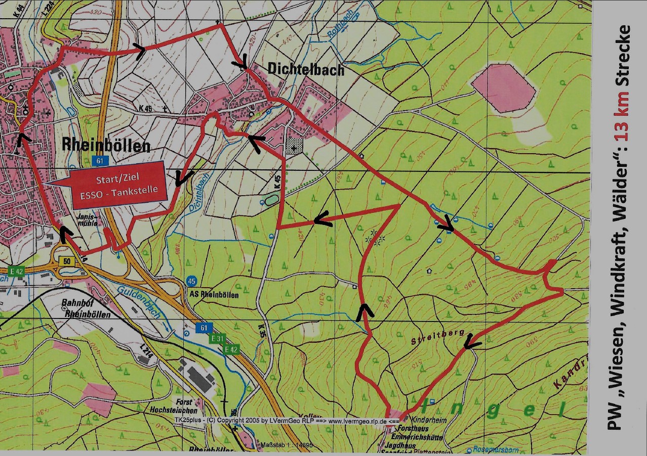 Nach Verlassen des Startlokals folgen Sie nach rechts der Bahnhofstraße geradeaus bis zur Bacharacher Straße, in die Sie nach rechts einbiegen. Nach ca. 500 m verlassen Sie die Bacharacher Straße nach rechts in die Alte Römerstraße. Sie wandern leicht ansteigend unter der Autobahn hindurch immer geradeaus bis zu einem Wegekreuz (auf Selbstkontrolle achten). Am Wegekreuz biegen Sie nach rechts auf die K 48 ab und folgen dieser geradeaus in die Ortschaft Dichtelbach. An der Streckenteilung wenden Sie sich nach links in die Rheinböllener Straße und folgen dieser in einem leichten Rechtsbogen, bis Sie nach links in die Straße „Lauschhütte“ abbiegen. Sie verlassen Dichtelbach und wandern geradeaus in den Wald. Diesem Waldweg folgen Sie leicht ansteigend, bis Sie an einen Teerweg gelangen (auf Selbstkontrolle achten) und scharf nach rechts auf diesen abbiegen. Sie folgen dem Teerweg ca. 300 m und biegen nach rechts auf einen befestigten Weg ab. An einer Gabelung halten Sie sich nach links und folgen der Beschilderung bis zur Waldgaststätte „Emmerichshütte“ (auf Selbstkontrolle achten). Hier empfiehlt sich eine Einkehr, und gut gestärkt wandern Sie nach rechts auf dem Teerweg leicht bergab. Vor einer Grillhütte verlassen Sie den Teerweg nach rechts in einen Waldweg und folgen diesem ca. 600 m immer geradeaus. Jetzt biegen Sie scharf nach links ab und folgen diesem Weg geradeaus bis zur Straße K 45. Sie folgen der K 45 nach rechts und wandern ab dem alten Sportplatz über einen Wiesenweg parallel zur K 45 bis zum Ortseingang von Dichtelbach. Am Ortseingang verlassen Sie die K 45 nach links und wandern auf einem Teerweg am Ortsrand entlang bis zur Rheinböller Straße. Sie wandern nach links, bis Sie in Höhe einer Scheune wieder nach links zusammen mit der 5 km Strecke in einen Teerweg abbiegen, der bald in einen geschotterten Weg übergeht. Diesem folgen Sie leicht bergab durch Felder und Wiesen (am Waldrand auf Selbstkontrolle achten), bis Sie wieder an einen Teerweg gelangen. Diesem folgen Sie nach links bis zur Autobahnbrücke, überqueren die Autobahn nach rechts über die Überführung und biegen nach ca. 100 m scharf nach links ab. Nach weiteren ca. 150 m biegen Sie nach rechts ab und folgen diesem Weg bis zur Bahnhofstraße. Hier biegen Sie nach rechts ab und folgen der Bahnhofstraße bis zu Start/Ziel, der ESSO-Tankstelle.