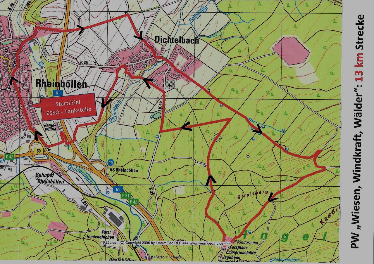 Nach Verlassen des Startlokals folgen Sie nach rechts der Bahnhofstraße geradeaus bis zur Bacharacher Straße, in die Sie nach rechts einbiegen. Nach ca. 500 m verlassen Sie die Bacharacher Straße nach rechts in die Alte Römerstraße. Sie wandern leicht ansteigend unter der Autobahn hindurch immer geradeaus bis zu einem Wegekreuz (auf Selbstkontrolle achten). Am Wegekreuz biegen Sie nach rechts auf die K 48 ab und folgen dieser geradeaus in die Ortschaft Dichtelbach. An der Streckenteilung wenden Sie sich nach rechts in die Rheinböllener Straße und folgen dieser durch den Ort, bis Sie in Höhe einer Scheune nach links in einen Teerweg abbiegen, der bald in einen geschotterten Weg übergeht. Diesem folgen Sie leicht bergab durch Felder und Wiesen (am Waldrand auf Selbstkontrolle achten), bis Sie wieder an einen Teerweg gelangen. Diesem folgen Sie nach links bis zur Autobahnbrücke, überqueren die Autobahn nach rechts über die Überführung und biegen nach ca. 100 m scharf nach links ab. Nach weiteren ca. 150 m biegen Sie nach rechts ab und folgen diesem Weg bis zur Bahnhofstraße. Hier biegen Sie nach rechts ab und folgen der Bahnhofstraße bis zu Start/Ziel, der ESSO-Tankstelle.