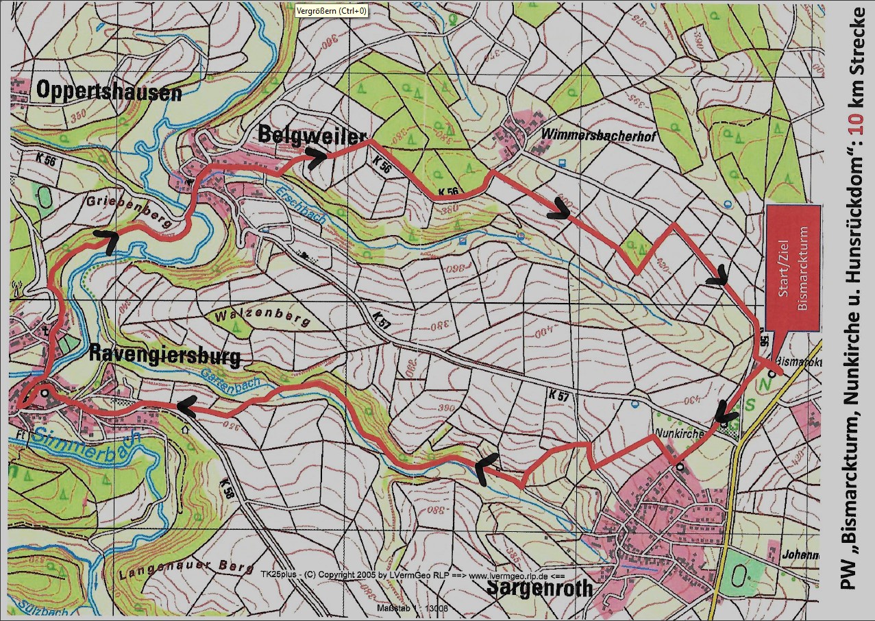 Nach dem Erwerb ihrer Startkarte im Dorfladen begeben Sie sich zum Bismarckturm und starten dort mit ihrer Wanderung. Rechts am Bismarckturm vorbei gelangen Sie gleich an die Streckenteilung. Hier gehen Sie nach links über einen Wiesenweg bis an die Straße. Dieser folgen Sie nach links an der Nunkirche vorbei und geradeaus über eine Kreuzung in die Ortschaft Sargenroth. Sie wenden sich nach rechts in die Soonwaldstraße und gehen hinter einem Bauernhof links in einen Wiesenweg. Diesem folgen Sie leicht bergab bis Sie an einen Teerweg gelangen. Diesem Weg folgen Sie nach rechts Richtung Ravengiersburg. An einer Gabelung halten Sie sich nach rechts und wandern am Waldrand vorbei, bis Sie an einer Gabelung (auf SK achten) links auf dem Teerweg leicht bergan zu einer Straße (K 58) gelangen. Sie folgen der K 58 in den Ort, gehen rechts um den „Hunsrückdom“ herum und gelangen gegenüber dem Hauptportal über Treppen hinunter zur Hauptstraße. Hier wenden Sie sich nach rechts und überqueren nach gut 200 m eine Brücke nach links. Bergauf gelangen Sie am Ende der Leitplanke über einen Pfad an eine Schutzhütte. Hinter der Schutzhütte geht es nach rechts im Wald bergab, und weiter durch ein Wiesental, immer am Waldrand entlang, bis an die Kreisstraße 56. Sie folgen der K 56 nach rechts über eine Brücke in die Ortschaft Belgweiler. Hier wandern Sie nach links in die Hauptstraße leicht ansteigend, bis Sie nach rechts in den Erschbacher Weg abbiegen. Am Ende des Erschbacher Weges (auf SK achten) wandern Sie nach links hoch, geradeaus über einen einen Schotter- und einen Wiesenweg bis zur K 56. Sie wandern nach rechts der K 56 entlang bis kurz vor den „Wimmersbacherhof“, wo Sie nach rechts in einen Wiesenweg einbiegen. Diesem Weg folgen Sie und wandern rechts an einem kleinen Wäldchen vorbei. Hinter den Wäldchen geht nach links leicht bergan, bis Sie wieder an die K 56 gelangen. Sie folgen der K 56 nach rechts, bis Sie vor einer Hundeanlage nach links über einen Wiesenweg wieder an ihr Ziel am Bismarckturm gelangen.