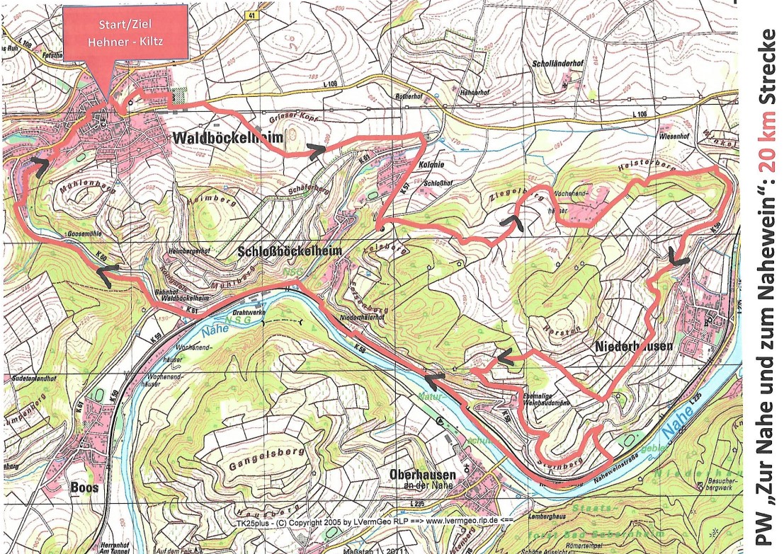 Nach Verlassen des Startlokals überqueren Sie die Hauptstraße, gehen wenige Meter nach links und biegen dann nach rechts in die Schneiderstraße ein. Nach ca. 60 m verlassen Sie die Schneiderstraße nach links in den Kirchberg, gehen über eine Anhöhe vorbei an der neugotischen Kirche St. Peter, folgen einem Fußweg über einen Spielplatz bis zum Friedhof. Vor dem Friedhof gehen Sie nach rechts bergab, überqueren die Hüffelsheimer Straße, halten sich nach links bis Sie auf dem Geh- und Fußweg nach ca. 250 m die Streckenteilung erreichen. Hier biegen Sie nach rechts in einen Teerweg, folgen diesem ca. 1 km und gelangen über eine kleine Anhöhe auf einem Schotterweg weiter bis zur nächsten Streckenteilung. Hier gehen sie den Feldweg weiter geradeaus ins Tal, gelangen geradeaus auf einen Teerweg. Vor dem Friedhof nach rechts gehen, die K 61 überqueren, und geradeaus in die K 57 (Schlosstraße) einbiegen. Auf dem Gehweg wandern sie an der K 57 entlang leicht bergauf, bis Sie nach links in einen Teerweg abbiegen. An der Gabelung links halten (auf SK achten) und nach der Anhöhe am Wegende links bergab in einem Wiesenweg weiter bis zur nächsten Einmündung gehen. Hier folgen Sie nach rechts einem Schotterweg, wandern geradeaus und bergauf über eine Anhöhe, und folgen dem Weg geradeaus (auf SK achten) durch den Wald und am Waldrand hinunter bis unmittelbar vor eine Autostraße. Hier wandern Sie nach rechts hoch (Weinwanderweg Rhein-Nahe), parallel zum Hang (Blick zum Stausee Niederhausen mit Kraftwerk), links an einer Rentierfarm vorbei. Sie bleiben auf dem Teerweg und folgen der Beschilderung auf der Höhe durch die Weinberge, biegen nach rechts ab und gehen leicht bergan, bis es auf der Anhöhe nach links in den Wald abgeht. Am Waldende geht es auf einem Teerweg links abwärts. Vor dem Weingut Hermannsberg verlassen sie den Teerweg nach links, gehen auf einem Schotterweg an einem Weinberg vorbei und biegen rechts in einen Teerweg ein. Nach wenigen Metern geht es nach links ab, sie folgen diesem Höhenweg bis es scharf nach rechts in einen Schotterweg geht. Diesem Weg folgen sie abwärts durch die Weinberge, unterqueren ein Viadukt und folgen nach rechts dem Radweg entlang der L 235 vorbei am Restaurant Hermannshöhle immer geradeaus. In einer scharfen Linkskurve vor einer Brücke verlassen Sie die L 235 geradeaus und folgen einem schmalen Pfad bis Sie auf die K 58 gelangen. Dieser folgen Sie nach links entlang der Bahnlinie. An einem Bahnübergang gehen Sie gerade aus weiter in einen unbefestigten Weg, und gelangen nach links durch ein Viadukt wieder an die K 58. Sie halten sich nach rechts, vorbei am Restaurant „Niederthäler Hof“ entlang der K 58 über eine Eisenbahnbrücke bis zur Einmündung in die K 61. Sie wandern nach links immer entlang der K 61. An der zweiten Abzweigung (Rtg. Staudernheim) gehen Sie nach links und wandern nach wenigen Metern nach rechts in einen Waldweg. Diesem folgen Sie bis Waldböckelheim (auf SK achten), überqueren die K 60 in die Straße „Im Brühl“. Dieser auf dem Gehweg folgen, nach links in den „Oberen Brühl“ abbiegen und nach rechts in einen schmalen Pfad, geradeaus durch den „Unteren Bachweg“ bis zur Lindenstraße gehen. Hier nach links halten zur Hauptstraße und dieser nach rechts folgen bis zum Start/Ziel, dem Restaurant – Weinhaus Hehner-Kiltz.