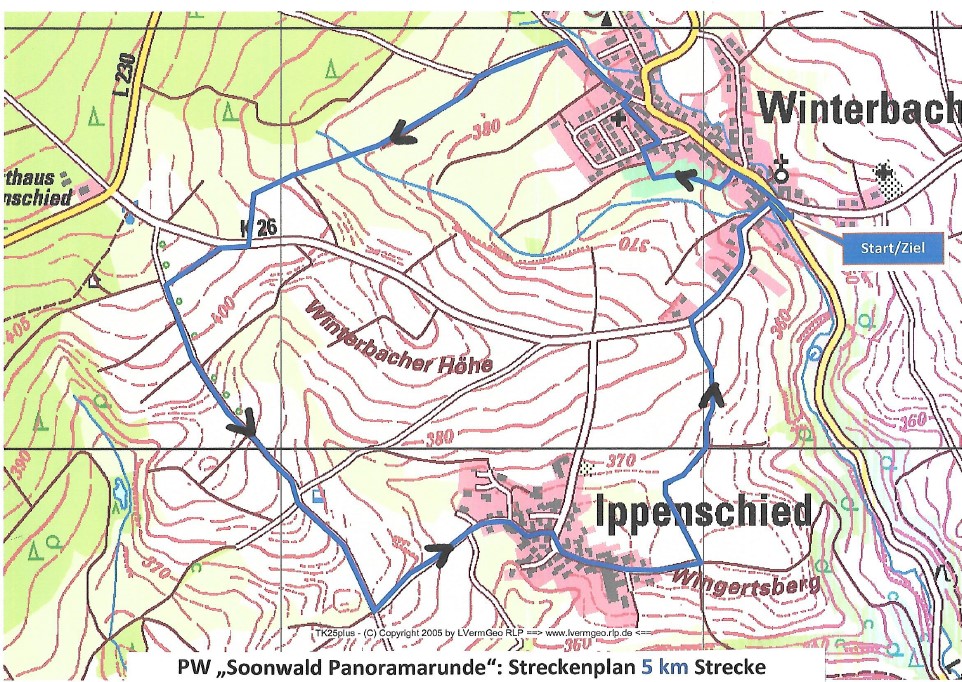 Nach Verlassen des Dorfladens folgen Sie der Beschilderung Richtung Simmern in die Soonwaldstraße und gehen auf dem linken Gehweg Richtung Ortsmitte. Gleich hinter der Hausnummer 13 biegen sie links ab und gelangen in einen unbefestigten Fußweg. Diesem folgen sie, an einer Weggabelung gehen Sie nach links, und gelangen am Feuerwehrhaus in die Straße „In der Heide“. Sie halten sich nach rechts und biegen gleich wieder nach links in die Rathausstraße ab. Am Ende der Rathausstraße halten Sie sich nach rechts und gelangen in die Waldstraße. Dieser folgen Sie nach links, passieren die Schreinerei Kielburger, und biegen nach links in einen unbefestigten Wirtschaftsweg ab. Diesem folgenden Sie am Waldrand vorbei (auf Selbstkontrolle achten) bis an die K 26, gehen nach rechts und biegen nach wenigen Metern nach links in einen Wiesenweg ein. Dann biegen Sie nach links auf einen asphaltierten Wirtschaftsweg und folgen diesem immer geradeaus bis zur Streckenteilung. Hier halten Sie sich nach links und gehen auf die Ortschaft Ippenschied zu (auf Selbstkontrolle achten), durchqueren den Ort durch die Sonnwald- und die Hauptstraße, biegen am Ortsende nach links ab und folgen diesem Weg, bis sie am Ortseingang von Winterbach in die Bergstraße (K 26) gelangen. Dieser folgen Sie nach rechts auf dem Gehweg leicht bergab und gelangen wieder in die Soonwaldstraße zum Start/Ziel, dem Dorfladen am Soonwald.